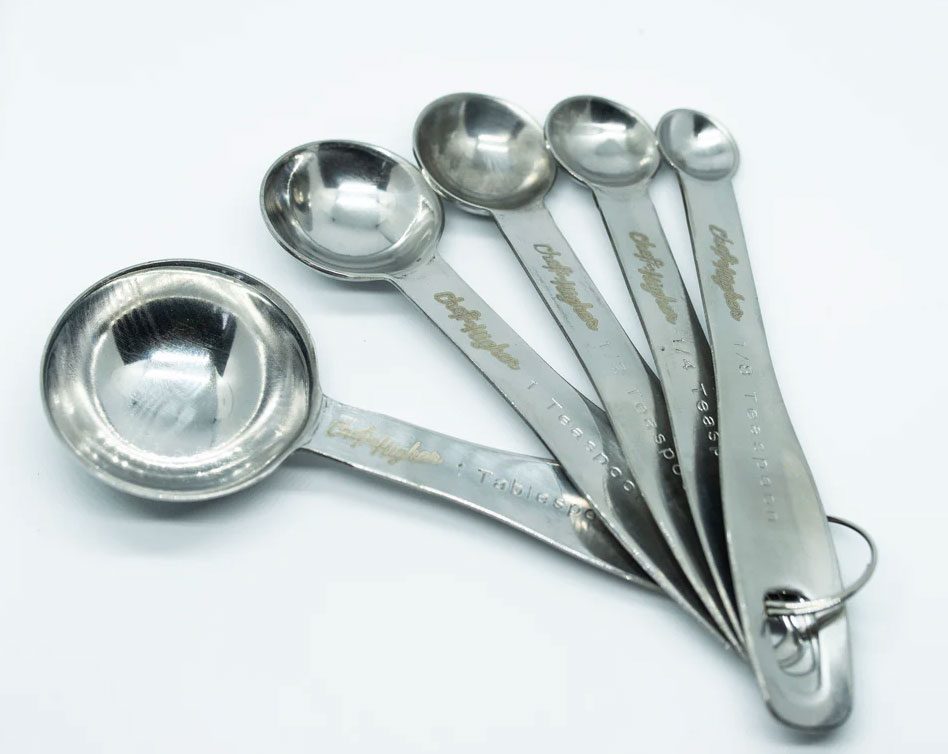 Get your kitchen vibes right so you ensure you’re measurements are on point with our Chef For Higher branded set. The 5-piece set has 1/8 teaspoon, 1/4 teaspoon, 1/2 teaspoon, 1 Teaspoon & 1 Tablespoon. Stainless steel with laser etched logo.