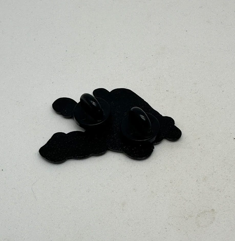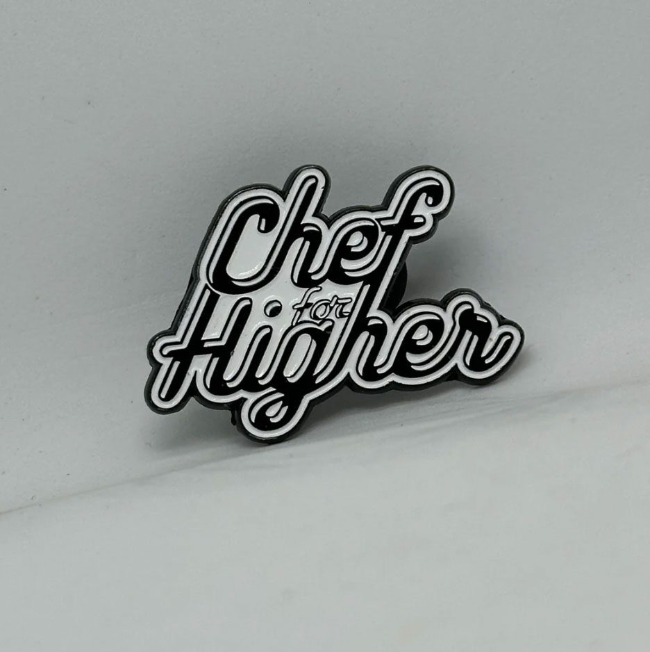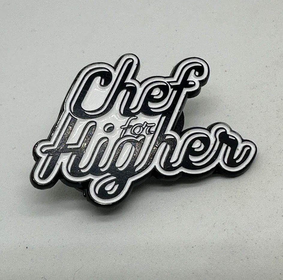 Chef For Higher logo pin. Black & white enamel pin with two fasteners.